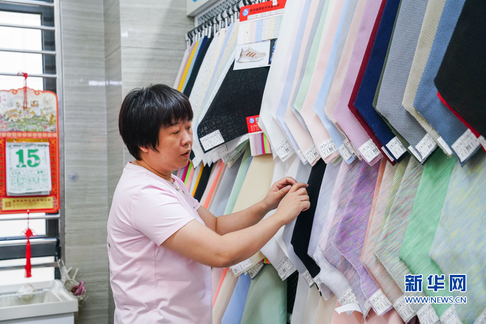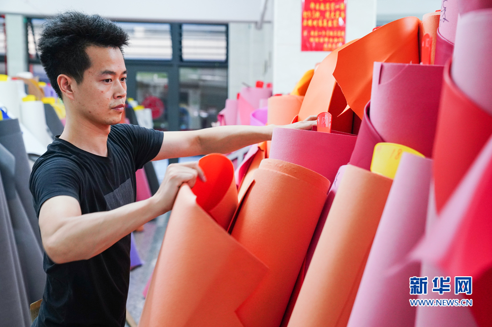 8月15日,晋江国际鞋纺城内的泉州海鸥鞋材有限公司,工人在整理新近生产的冰凉布。