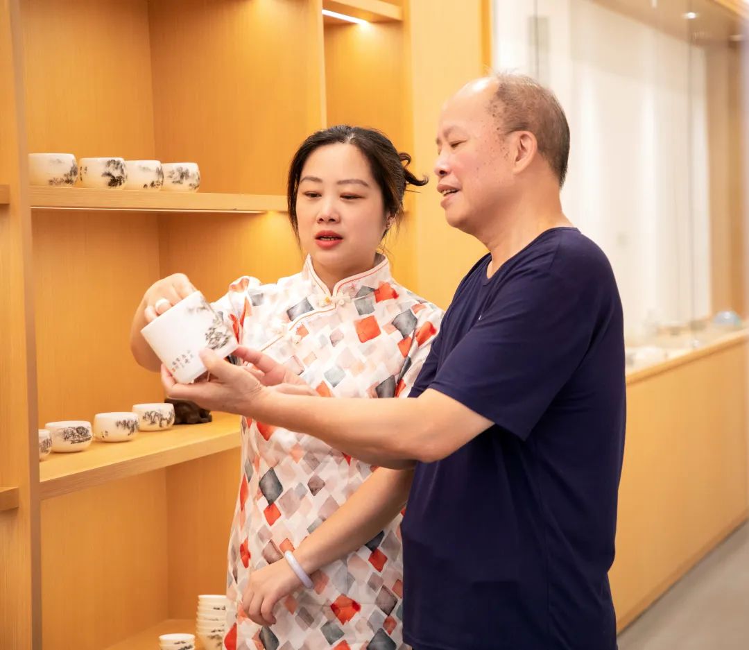 走进“林记金陞”品牌展厅,介绍家族谱系的展板、泛黄的手稿、与互联网汽车平台合作的瓷绘茶具……讲述着百年瓷画世家的传承故事。